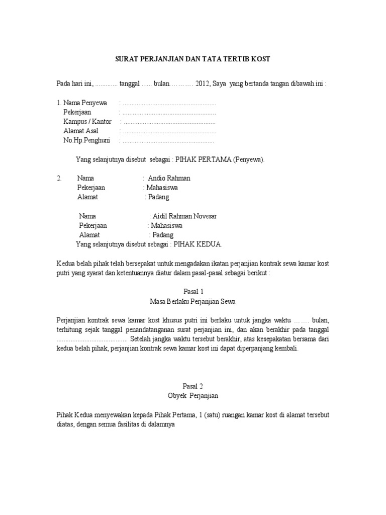 Ada beberapa contoh perkara yang bisa diatur didalam surat perjanjian antara lain. Contoh Surat Perjanjian Sewa Kamar Kost. Tamu hanya diperbolehkan sampai jam 2200 WIT.